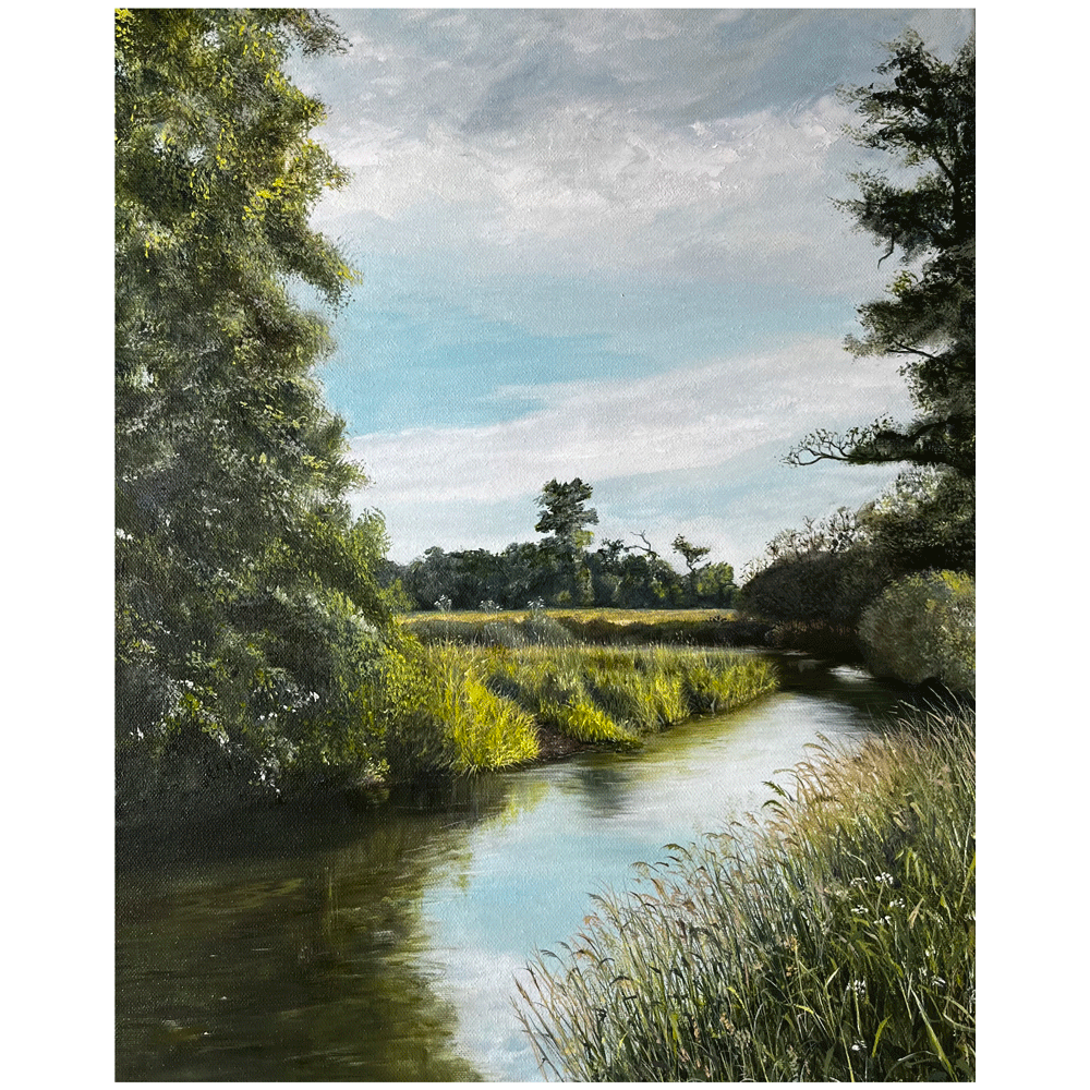 Immerse yourself in the tranquil pastoral beauty of David Edwards’ “River Exe, Huxham.” This serene landscape transports the viewer to the lush Devon countryside, where gently rolling fields meet the meandering River Exe. Edwards’ masterful oils capture the glassy surface of the river in the foreground, reflecting the clouds drifting lazily across the sky above.